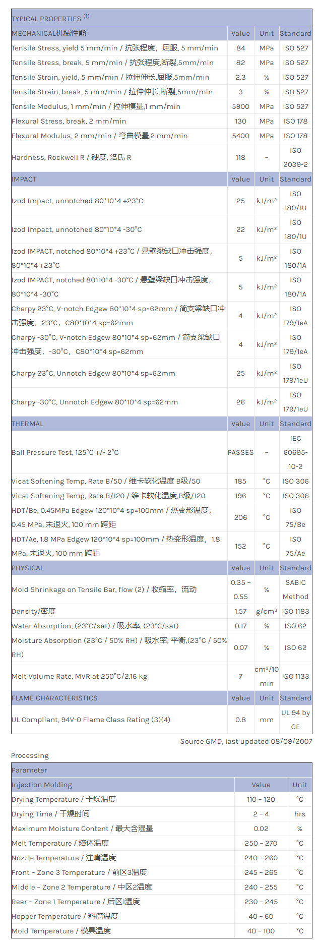 应用范围:产品描述Valox PBT EXVX1292物性表VALOX EXVX1292 is a 17% glass reinforced, flame retardant High UV stable injection moulding PBT resin. Applications: lamp sockets, connectors, switches, electrical housings an