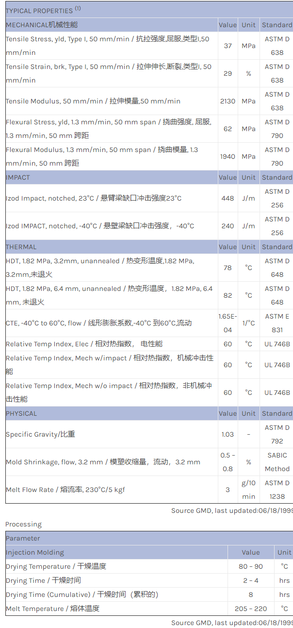 应用范围:产品描述CYCOLAC ABS GPX3800UV物性表High IMPACT, uv stabilised, extrusion grade of ABS
